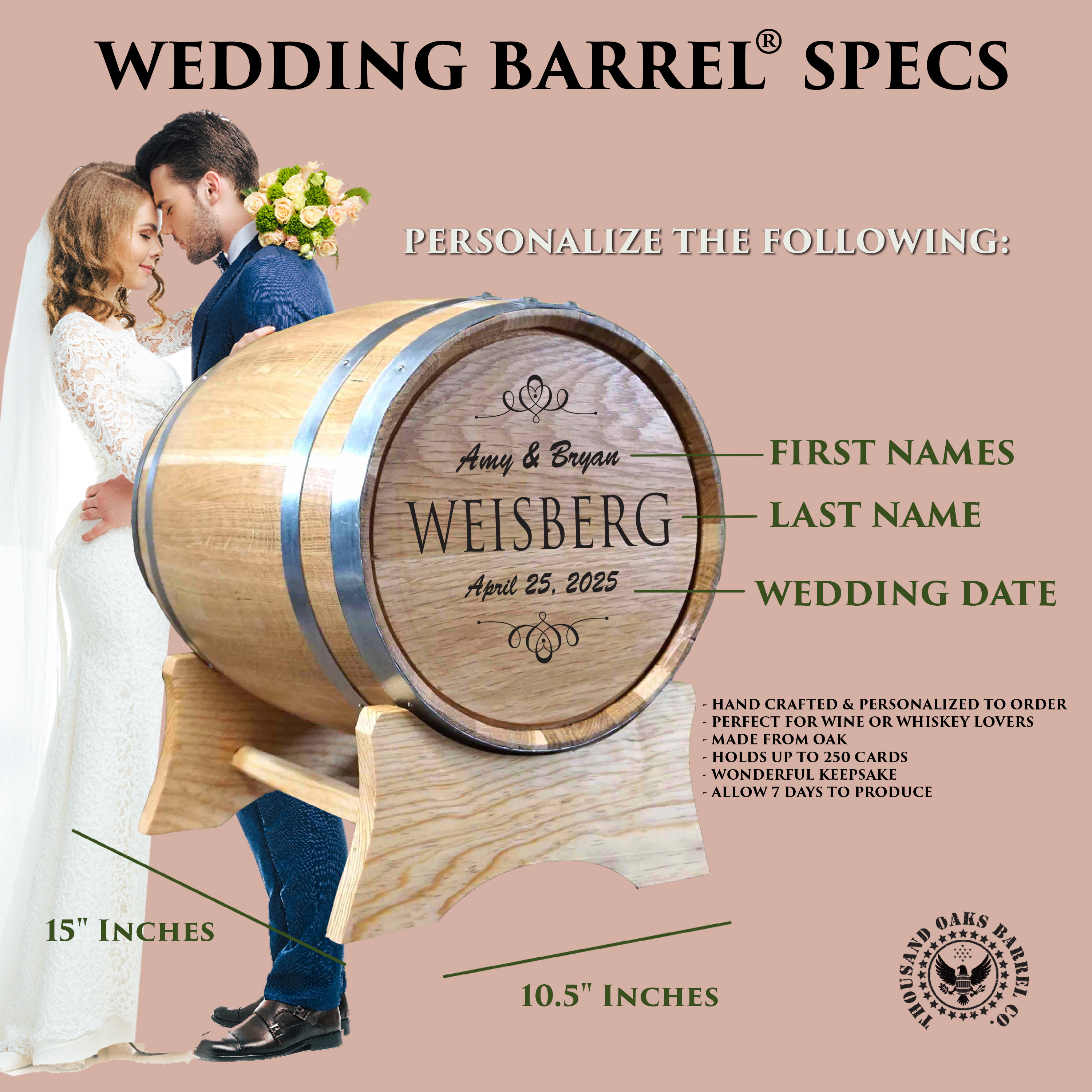 Make your wedding reception unforgettable with this Personalized Wedding Card Barrel, a stunning handcrafted piece designed to collect greeting cards, envelopes, and small gifts from guests.