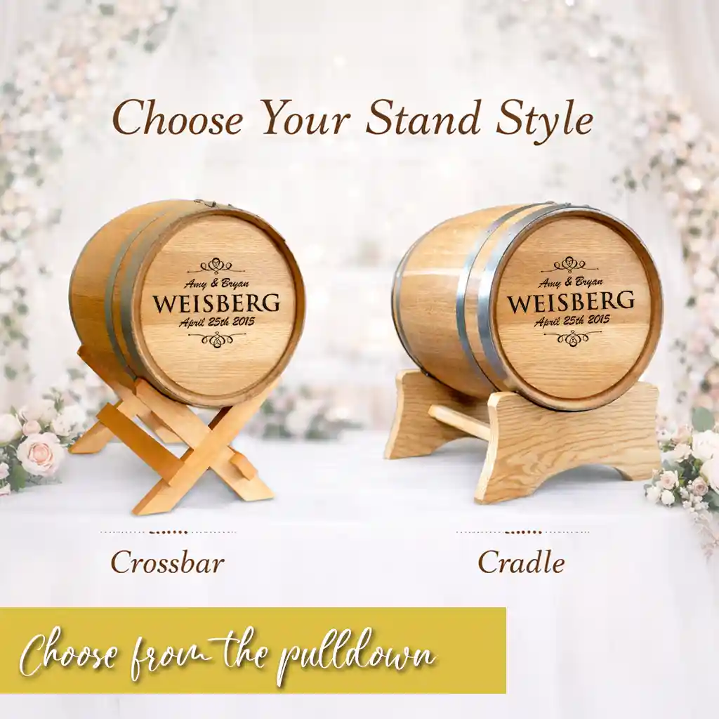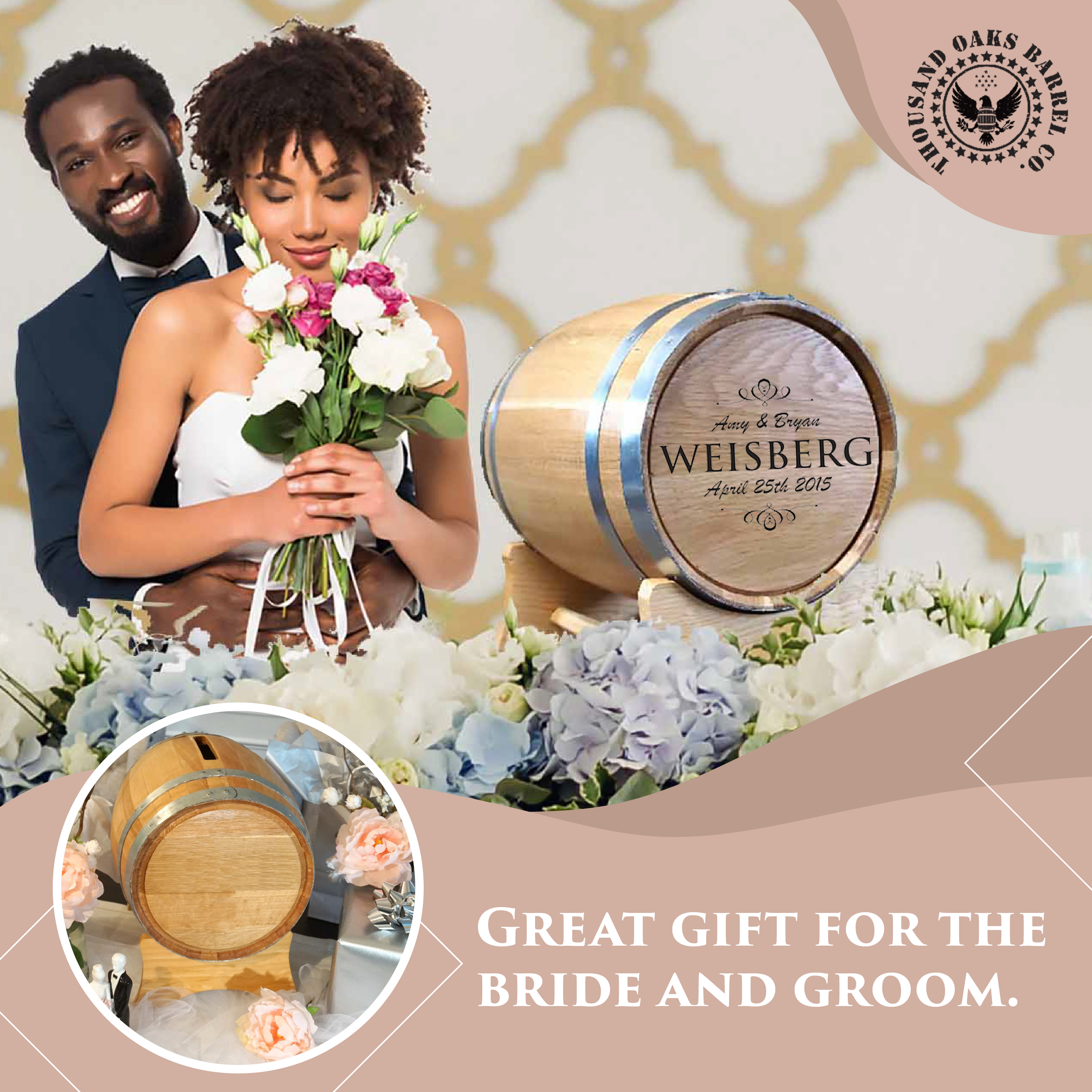 Crafted from premium oak wood, this unique barrel-shaped card holder combines timeless craftsmanship with elegant personalization. The front barrel head is custom engraved with the couple’s names and wedding date, transforming it into a meaningful keepsake long after the celebration ends.