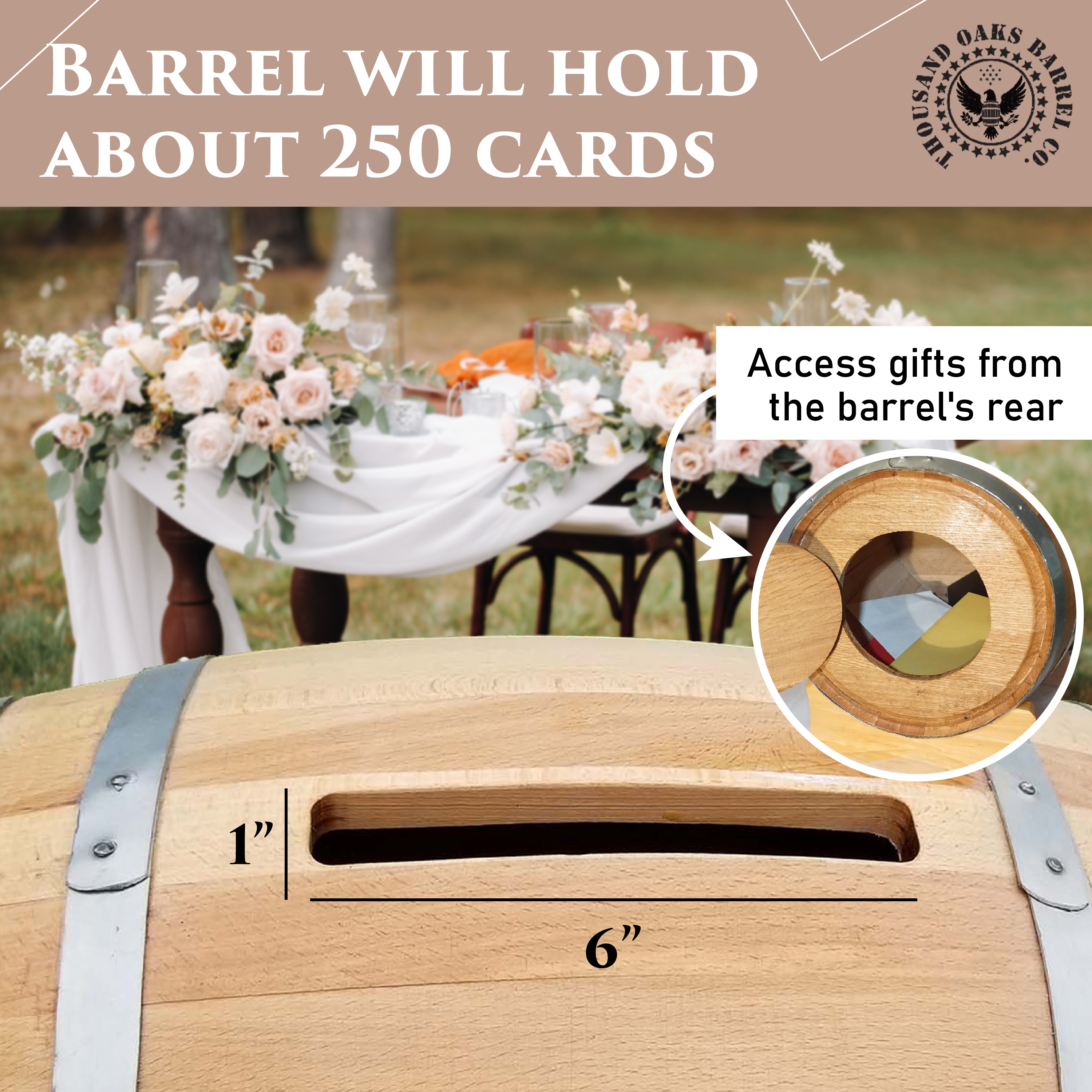 Perfect for rustic weddings, winery weddings, vineyard receptions, barn weddings, and elegant outdoor ceremonies, the wedding barrel instantly becomes a beautiful focal point on your gift table.